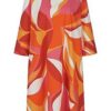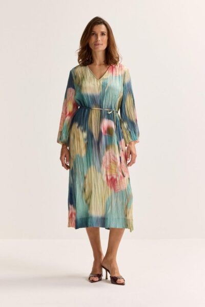Showstopper alert! Deze rechte V-halsjurk in crinkle satijn laat je schitteren op elk speciaal moment. De aquarelprint met rode rozen is een visueel spektakel terwijl de elegante driekwartsmouwen subtiel je armen accentueren. Draag hem los voor nonchalante flair of tailleer met het fijne striklint. Perfecte snit, spectaculair effect.