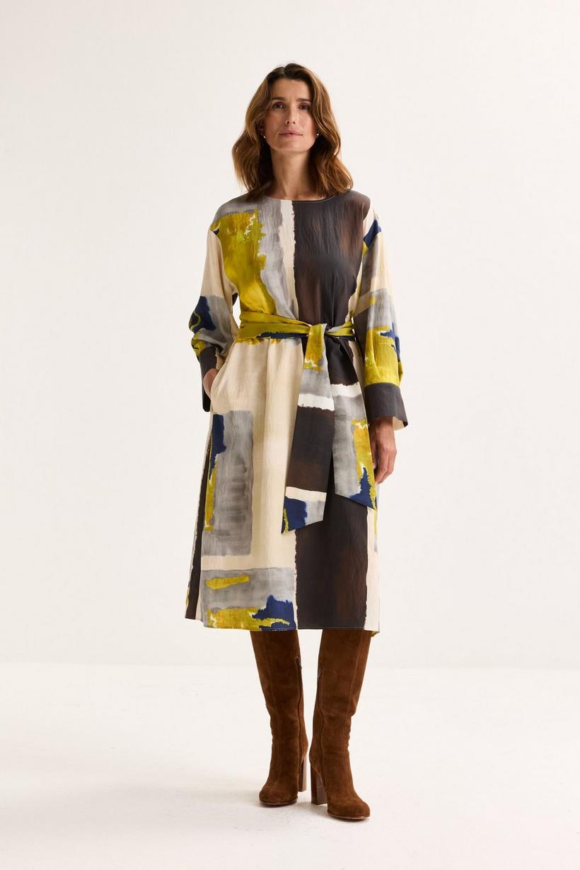 Discrete chic met een artistieke flair… Deze bijzonder stylish jurk valt op door zijn ingetogen elegantie. De arty print — een knipoog naar het werk van Nicolas de Staël — trekt alle aandacht met abstracte kleurvlakken die doen denken aan een modern schilderij. De soepel vallende viscosemix met vintage finish voelt licht aan en beweegt moeiteloos met je mee. Draag je jurk los voor een ontspannen silhouet, of accentueer je taille met de bijpassende ceintuur. De dubbele rugplooi zorgt voor extra bewegingsvrijheid, en in de zijnaden zitten twee handige zakken subtiel verstopt. De wijde driekwartmouwen met brede manchetten geven de jurk een elegante, hedendaagse touch.