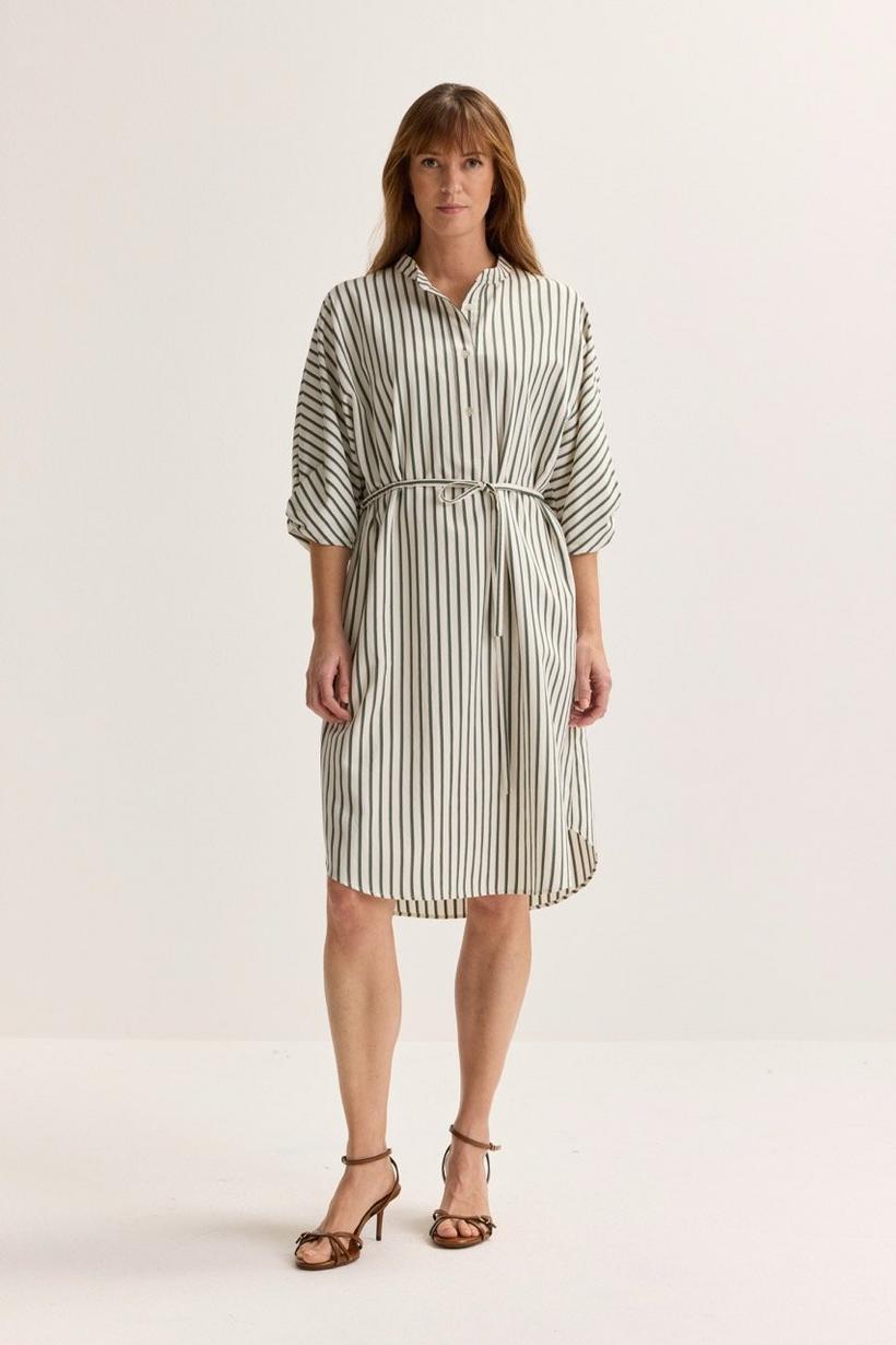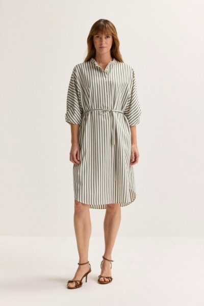 Elegant en stijlvol, maar tegelijk fris en comfortabel: deze gestreepte rechte jurk in zacht twill heeft alles. De nacré knoopjes vooraan en de afgeronde zoom geven hem een effortless chic uitstraling, terwijl de gedrapeerde mouwen voor een subtiel wow‑effect zorgen. Een staaltje Mayerline‑vakmanschap is de afneembare bindceintuur met ingewerkt elastiek, waardoor hij altijd perfect aansluit.