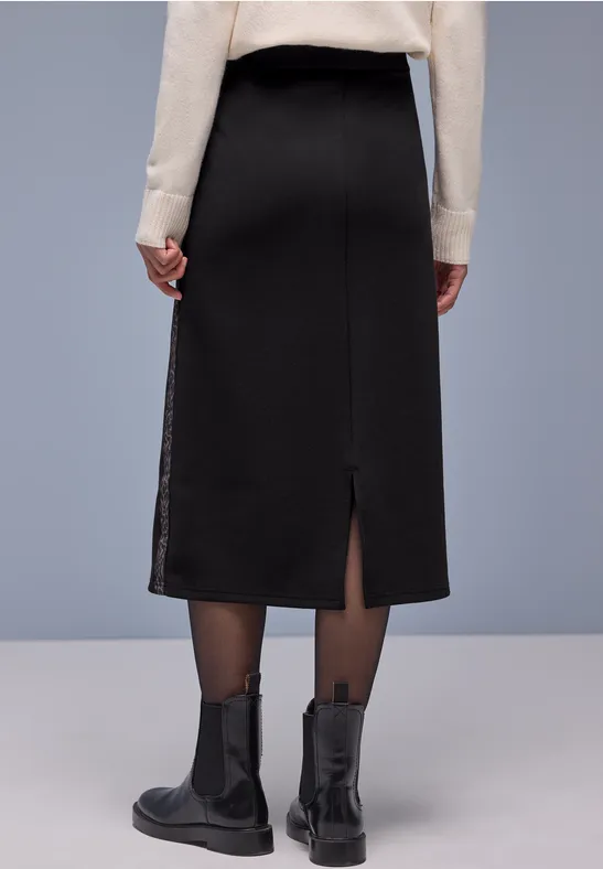 De vrouwelijke jersey rok in Pepica-stijl van Street One combineert comfort met een fashion statement. De leo galloon streep voegt spanning toe aan de effen look, terwijl de Stretch tailleband zorgt voor een comfortabele pasvorm. Een kleine split aan de achterkant geeft de look een moderne touch – ideaal voor vrouwelijke alledaagse stijlen.