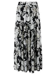 Rok van UTA RAASCH met goed zittende, verstevigde band en doorlopende rand bovenlangs. Elegant en flatteus in uitlopend model met stroken van soepel weefsel van 100% viscose. De print van chique bloemimpressies maakt iedere rok uniek. Lengte ca. 95 cm. Machinewasbaar. fijnwas tot 30°. chloorbleken niet mogelijk. warm strijken. chemische reiniging. drogen in de droger niet mogelijk. 36, 38, 40, 42, 44, 46, 48