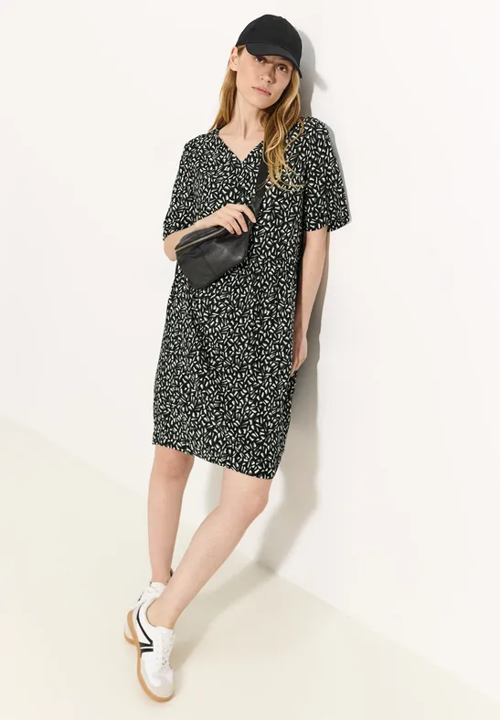 Deze knielange zomerjurk van CECIL voor dames met zijn leuke print is ideaal voor warme dagen. De V-hals met knooppas geeft de jurk een elegant tintje. De enigszins klokkende mouwen en lichte taillering zorgen voor het vrouwelijke silhouet, terwijl het grafische patroon de jurk een moderne touch geeft.