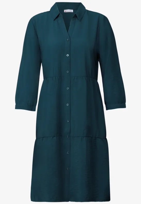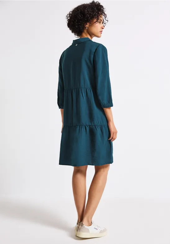 Ideaal voor warme dagen: de zomerse tuniekjurk van Street One voor dames is een echte allrounder voor vrouwelijke looks. De lichtgewicht viscosemix voelt comfortabel aan op de huid, terwijl de volants, overhemdkraag en knoopsluiting de jurk een speelse en toch moderne look geven. De 3/4-mouwen met manchetten benadrukken het luchtige silhouet.