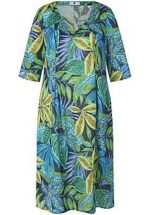 ANNA AURA jurk met een ronde V-hals en 3/4-mouwen. Elegant gedrapeerd, figuurflatterend en super elegant van hoogwaardige viscosestof. Casual, licht uitlopende A-lijn stijl met naadzakken. Elke jurk is uniek met een ontwerp van bladmotieven in blauw- en groentinten. 100% katoen. Gecertificeerd volgens Standard 100 van OEKO-TEX®. Lengte in maat 42 ca. 115 cm. Deze jurk is machinewasbaar. Valt klein uit, bestel een maat groter. fijnwas tot 30°. chloorbleken niet mogelijk. warm strijken. chemische reiniging. drogen in de droger niet mogelijk. 40, 42, 44, 46, 56