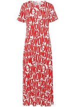 Jerseyjurk van EFIXELLE met korte mouwen. Opvallend aantrekkelijk, flatteus voor het figuur en absoluut trendy Moderne stijl in maxilengte met taillenaad en uitlopende rok in soepele, mooi vallende slinky-jersey van 93% viscose, 7% elastan. Het dessin van LOVE-opschriften maakt iedere jurk uniek. Lengte ca. 126 cm. Machinewasbaar. fijnwas tot 30°. chloorbleken niet mogelijk. warm strijken. chemische reiniging. drogen in de droger niet mogelijk. 36, 38, 40