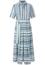 Jurk van FADENMEISTER BERLIN met korte mouwen. Geraffineerd model met modieus elan een zomerse jurk voor kantoor, city en elke dag Uitstekende kwaliteit met dynamisch streepdessin en de ingenieuze belijning met een overhemdkraag en knoopsluiting in het smalle lijfje, een wijd uitlopende rok met plooien rondom, naadzakken en bindceintuur staan voor de veeleisende FADENMEISTER BERLIN-stijl. 83% viscose, 17% polyamide. Gecertificeerd volgens Standard 100 by OEKO-TEX®. Lengte ca. 120 cm. Machinewasbaar. fijnwas tot 30°. chloorbleken niet mogelijk. warm strijken. chemische reiniging, veilig. drogen in de droger niet mogelijk. 40, 42, 44, 46, 48