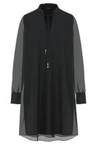 JOOP jurk met lange mouwen en een V-hals, afgewerkt met gouden korenbloemranden op de strikbanden. Deze uitzonderlijk comfortabele, losvallende jurk heeft een uitlopend silhouet en een plooi aan de achterkant. Gemaakt van een transparante stof. 100% gerecycled polyester. Een voering van 91% polyester en 9% elastaan zorgt voor ondoorzichtigheid. Lengte ca. 93 cm. Deze jurk is machinewasbaar. speciale fijnwas tot 30°. chloorbleken niet mogelijk. koud strijken. chemische reiniging, veilig. drogen in de droger niet mogelijk. 34, 36, 38, 40