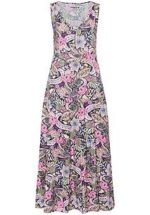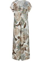 Lange jurk van HUTSCHREUTHER casual, luchtig, love you Casual, armloze stijl met uitgesneden schouders, een comfortabele zijsplit aan de zoom en een decoratief element en brede stolpplooi aan de V-hals. De bladprint zorgt voor een individuele uitstraling op elke jurk. 93% viscose, 7% elastaan. De lengte ca. 125 cm. Deze jurk is wasbaar in de machine. fijnwas tot 30°. chloorbleken niet mogelijk. koud strijken. niet chemisch te reinigen. drogen in de droger niet mogelijk. 36, 38, 40, 42, 44, 46, 48, 50