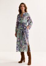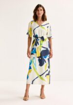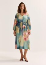 Een uitzonderlijke jurk voor een uitzonderlijke vrouw — zoals jij! Dit elegante model met zijn artistieke aquarelprint en romantische klokmouwen charmeert met een pasvorm die als gegoten zit en een prachtige, vloeiende doorval.