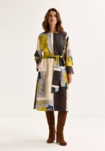 Deze bijzonder stylish jurk valt op door zijn ingetogen elegantie. De arty print — een knipoog naar het werk van Nicolas de Staël — trekt alle aandacht met abstracte kleurvlakken die doen denken aan een modern schilderij. De soepel vallende viscosemix met vintage finish voelt licht aan en beweegt moeiteloos met je mee. Draag je jurk los voor een ontspannen silhouet, of accentueer je taille met de bijpassende ceintuur. De dubbele rugplooi zorgt voor extra bewegingsvrijheid, en in de zijnaden zitten twee handige zakken subtiel verstopt. De wijde driekwartmouwen met brede manchetten geven de jurk een elegante, hedendaagse touch. -