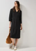 Deze jurk van CECIL, in een trendy salt-and-pepper look, heeft een gevlekte look en een sportieve trechterhals met tunnelkoord. Het knielengte model, de praktische zakken en de casual stijl maken het de ideale keuze voor gezellige alledaagse momenten. De zachte mix van materialen maakt het comfortabel om te dragen.