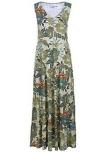 Mouwloze “Lone” tricot jurk van GREEN COTTON met V-hals. Verleidelijk vrouwelijk met een prachtige all-over print van palmbomen en aapjes. Met licht geruwde schouders, speelse plooitjes onder de buste en een lange, uitlopende rok met ruches. Elk stuk is uniek. 100% katoen (biologisch), GOTS-gecertificeerd. Lengte ca. 135 cm. Deze jersey jurk is machinewasbaar. wasbaar tot 40°. chloorbleken niet mogelijk. warm strijken. niet chemisch te reinigen. drogen in de droger niet mogelijk. 36, 38, 40, 42