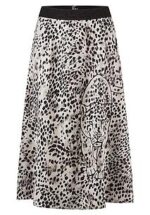 Midirok van BASLER met logoband. Elegante A-lijn, van chic satijn met innovatieve sneeuwluipaardprint en op dessin verwerkt luipaardcontour voor als extra, opvallend accent. Figuurnaden en een naaddunne ritssluiting zorgen voor een smal silhouet, het split opzij voor extra bewegingsvrijheid. Van 100% polyester. Lengte ca. 75 cm. Machinewasbaar. wasbaar tot 30°. chloorbleken niet mogelijk. warm strijken. chemische reiniging. drogen in de droger niet mogelijk. 36, 38, 40, 42, 44, 46, 48, 50, 52