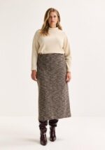 Deze enkellange kokerrok in soepel tweed sluit elegant aan en volgt de lijnen van je lichaam zonder te knellen. De hoge split geeft net dat beetje beweging – en een vleugje spanning. De onzichtbare ritssluiting aan de zijkant houdt het silhouet zuiver en gestroomlijnd.