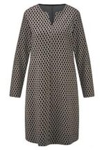 Jersey jurk van PETER HAHN met lange mouwen en kleine V-opening bij de ronde hals. Bijzonder comfortabel model van hoogwaardige heavy-jersey met grafisch minimal-dessin. Een perfecte jurk voor elke dag en elk figuur in iets uitlopende snit. 65% viscose, 32% polyamide, 3% elastan. Lengte ca. 98 cm. Machinewasbaar. fijnwas tot 30°. chloorbleken niet mogelijk. koud strijken. chemische reiniging. drogen in de droger niet mogelijk. 36, 38, 40, 42, 44, 46, 48, 50