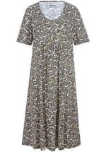 Jersey jurk “Selma” van GREEN COTTON met een wijde ronde halslijn en 1/2 mouwen in een lichtgewicht zomerstof van 100% katoen (biologisch), GOTS-gecertificeerd. Figuurvriendelijk, temperatuurregulerend en verleidelijk vrouwelijk met plooien onder de buste en comfortabele steekzakken. De levendige leoprint voegt een modieuze attitude toe – en is uiterst comfortabel om te dragen. Lengte ca. 110 cm. Deze jersey jurk is machinewasbaar. wasbaar tot 40°. chloorbleken niet mogelijk. warm strijken. niet chemisch te reinigen. drogen in de droger niet mogelijk. 36, 38, 40, 42