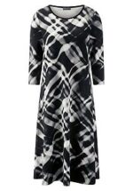 Jersey jurk van PAGANNE met een klein splitje op de 1/1 mouw. De grafische zwart-wit print maakt elk model uniek. Overhemdachtige snit met doorlopende knoopsluiting en zakken in de zijnaden – een ongecompliceerde jurk voor elke dag of een evenement. Kan met of zonder ceintuur worden gedragen. 88% polyester, 12% elastaan. Lengte ca. 100 cm. Deze jersey jurk is machinewasbaar. wasbaar tot 30°. chloorbleken niet mogelijk. koud strijken. chemische reiniging. drogen in de droger niet mogelijk. 36, 38, 40, 42, 44, 46, 48